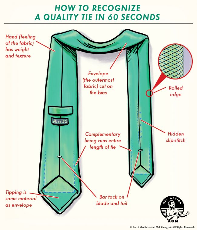 There’s actually a term in the clothing world that describes the feeling of the fabric that’s used on the outside of a tie (also known as the “envelope”): hand. When you pick up a tie, check its hand, feeling for its texture and weight. Quality ties feel hefty and the fabric — even on the finest silk ties — has a coarse texture thanks to its large weave. Heftier ties will be able to withstand the torture of being knotted over and over again. They bounce back faster and last longer.