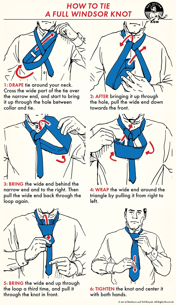 Because it’s a large knot, the Windsor should be worn with a spread collar. For men who are stout, or have wider faces and necks, the knot will look appropriately proportional with your build and mug, and should be your go-to tie knot.