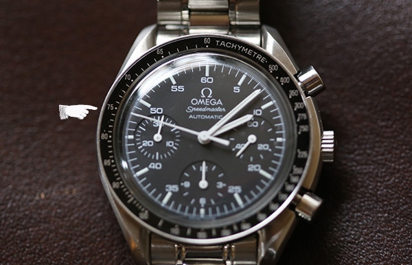 You might be thinking, “Where does a watch with a chronograph keep track of the seconds of the current time?” That’s done on one of the sub-dials on a watch’s face. On this Speedmaster, the second hand for the current time is on the right-side sub-dial.