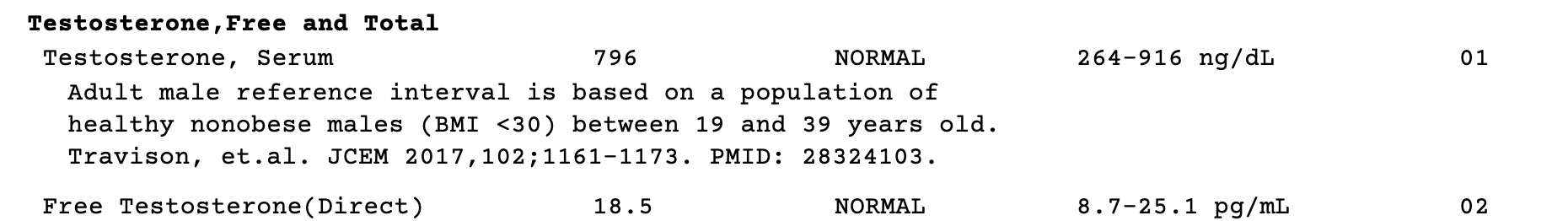 I took a test this month and the results showed I had 796 ng/dl total testosterone and 18.5 pg/ml free testosterone.