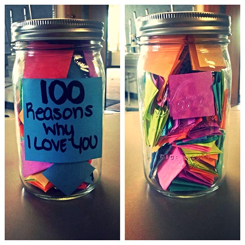 Your partner wants to be appreciated far more than she wants some material bauble. Think about all the reasons you love her, write them down on pieces of paper, fold them up, and then stick ’em in a jar. You don’t have to do 100. “10 Things I Love About You” will do. If you are feeling ambitious, 52 is a nice number; then she can open and read one of the messages once a week for a year. There are all kinds of ways you can jazz up the jar if you want, like etching something on the glass.
