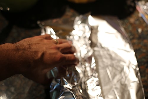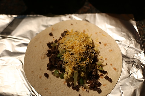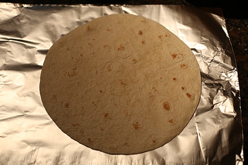 We’ve got all our ingredients prepared, so it’s time to start building. Place a tortilla on a medium-sized sheet of foil.