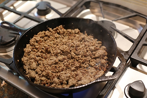 After the sausage has been browned, eat a bit of it because sausage is good. After that, put it in a bowl and set it aside for the burrito building stage later on.