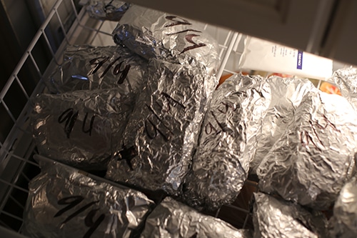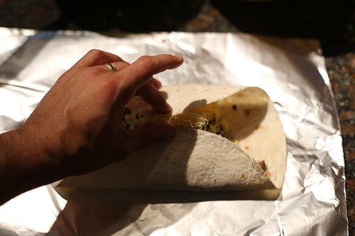 That looks like an awesome breakfast burrito. Don’t wrap the burritos in the foil right away. You want to let them cool a bit so you don’t build up condensation inside the foil and consequently create icy crystals on your burrito. Obviously, this means your whole kitchen counter will be filled with burritos resting on squares of foil. Alternatively, you can let all your ingredients cool, and then wrap each one up, foil and all. But I didn’t have the patience for that. Whatever route you go, repeat this burrito-building process until you’ve used all your ingredients.